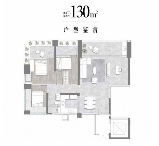 130㎡三房两厅两卫是入门款,总价约 700 万,全明格局设计,客厅连接南向阳台,主卧带独立卫浴,适合三口之家。