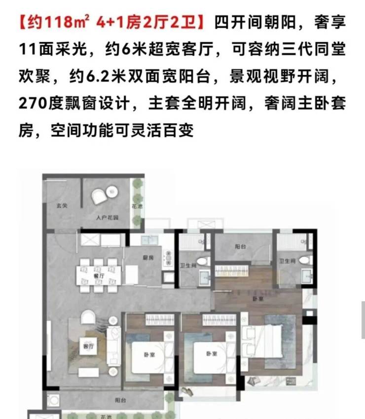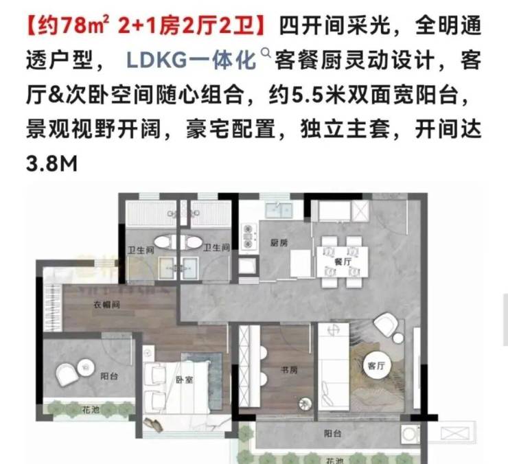 3、高实用率户型:最小户型78㎡起,主打刚需户型设计灵活,LDKG一体化客餐厅、双面宽阳台等设计,实用率超100%,赠送面积多。