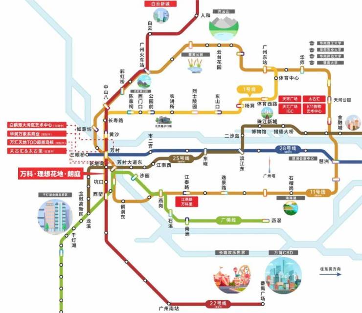 15条城市、城际轨道(规划中)汇聚,3地铁6线交汇(规划中)无缝链接大湾区,500米内1号线花地湾站,无需换乘,直达越秀天河。