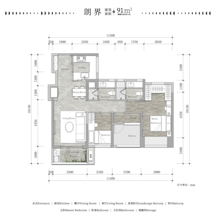 >> 建面约91㎡2房2厅2卫+1灵动空间 <<