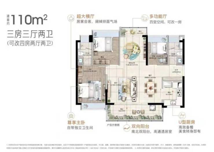 110㎡四房两厅两卫剩余少量现房房源,主要在 1-2 栋的 3-4 楼及高楼层,毛坯房 260 万起,带装修房 320 万起,LDK 一体化设计,客餐厨阳台连通,南向面宽达 10.2 米,次卧面积均在 9㎡以上,适合三口之家。