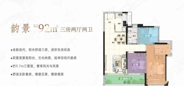 92㎡三房两厅两卫分布在 4 栋期房的 3-28 层,带装修交付,单价 2.6-3.05 万 /㎡,总价约 234 万起,采用 U 型厨房设计,预留双开门冰箱位置,生活阳台与观景阳台分开,家务和休闲互不干扰。