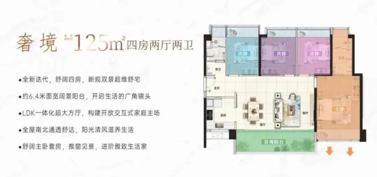 125㎡四房两厅两卫为改善型户型,位于 3 栋高楼层,带装修总价约 350 万起,双阳台设计,主卧带独立卫浴和步入式衣帽间,能俯瞰社区园林与山景,适合多人口家庭。
