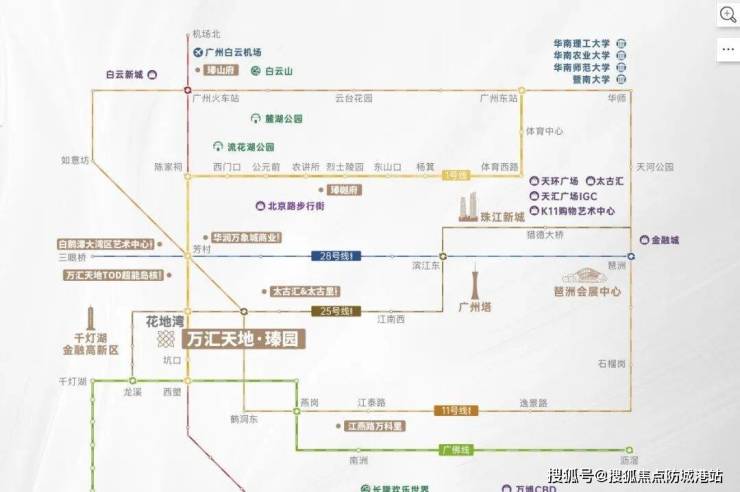 从交通视角看,瑧园的优势并非简单的地铁覆盖,而在于其位于广州轨道网络未来枢纽区的重要节点。花地湾站承担 1 号线与未来 25 号线的换乘职能,同时一站直达芳村 TOD,再无缝衔接 11 号线与 22 号线。在整个广州的出行体系中,11 号线被称为“换乘枢纽主线”,其覆盖的换乘站数量与联通能力,使居住者在瑧园能轻松触达任何中心区。对于自驾族而言,花地大道、龙溪大道、环城高速等多条主干道构成较为立体的交通体系。虽然现阶段部分路段存在高峰压力,但随着白鹅潭片区路网优化与产业导入完成,这种压力将被进一步分流。交通的本质,是城市价值的流动能力。瑧园正处在广州东西向能级转换的重要支点,其位置带来稳固的通勤效率,也为未来资产流动性奠定基础。