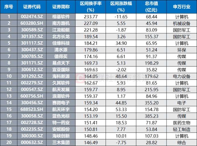 此外,从换手率数据上看,剔除新股影响,累计共有58股周换手率在100%以上。其中,榕基软件、南方路机、江龙船艇3股周换手率在2倍以上,分别达233.77%、227.09%、221.28%。同时,北方长龙、佳缘科技、清水源、值得买、易点天下、宣亚国际、海科新源、久其软件、航天发展、浪潮软件等股周换手率也居前。
