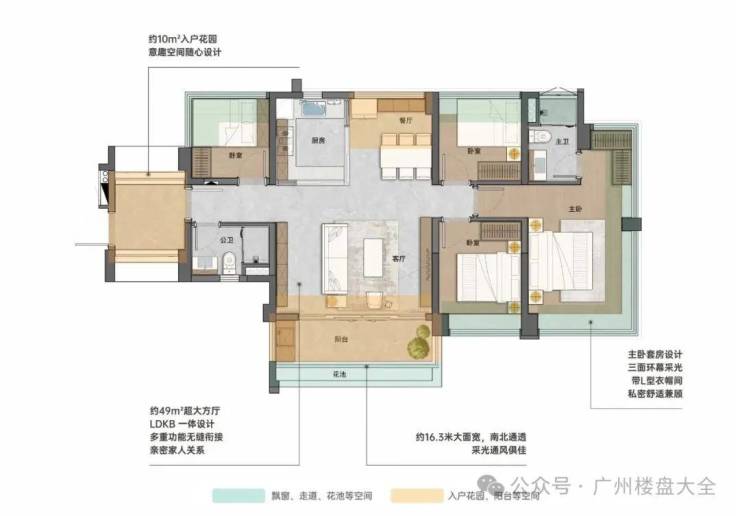 109㎡四房两厅两卫,五开间朝南,约16.3米大面宽,通风采光好,整个LDKB有49㎡,主套带L型衣帽间,三面环幕采光总价