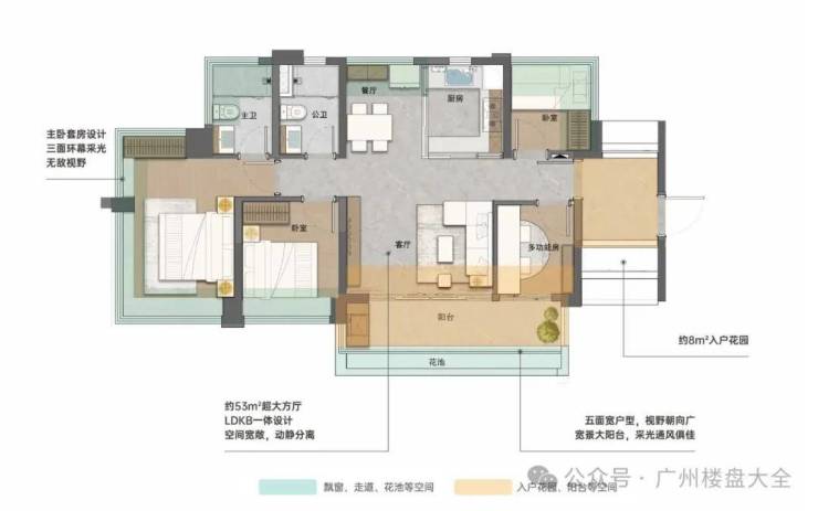 91㎡四房两厅两卫,户型同样也能做到5个空间两厅两卫,横厅设计,餐厅带飘窗,南北对流,五面宽户型,通风效果好,单边位,主卧套房更是做到三面采光。
