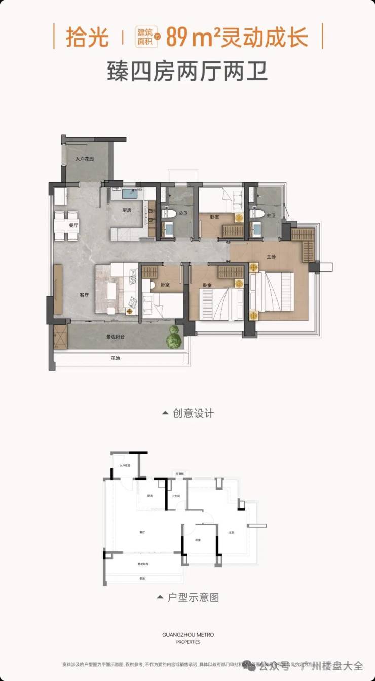 89㎡四房两厅两卫,可做到5空间两厅两卫,板房做了4房设计,入户花园更大,约12㎡,传统竖厅设计,U型厨房开放式设计,打造有岛台,连接餐客厅。