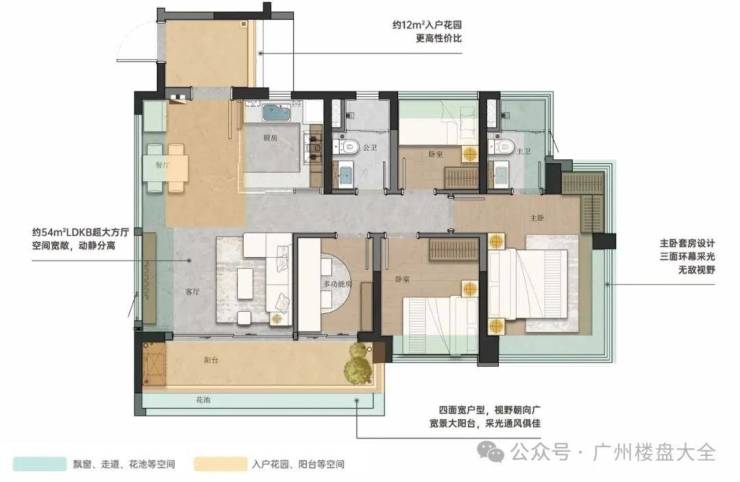 130㎡四房两厅三卫双主套,户型设计罕见,LDKB方厅尺度更大,整个空间约57㎡,U型厨房开放式设计,打造有岛台,直连餐厅。