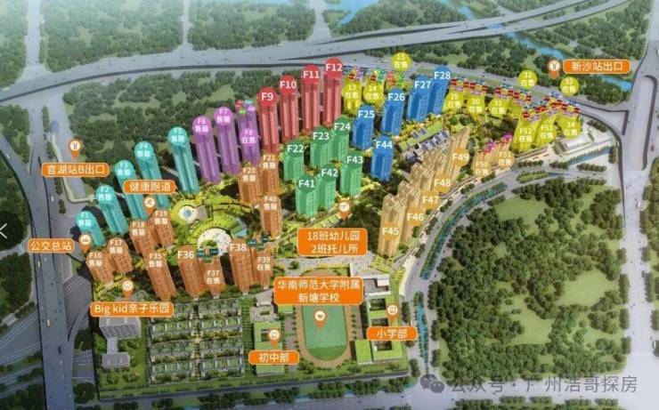 项目横跨地铁13号线官湖站与新沙站,东西主入口距两站仅 450米、650米 ,步行 5-10分钟 即可抵达。13号线二期 首通段( 鱼珠 至 天河公园 )在2025年10月已开通 ,未来可直达珠江新城、金融城等核心商务区,无需换乘,大幅提升通勤效率。
