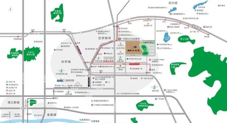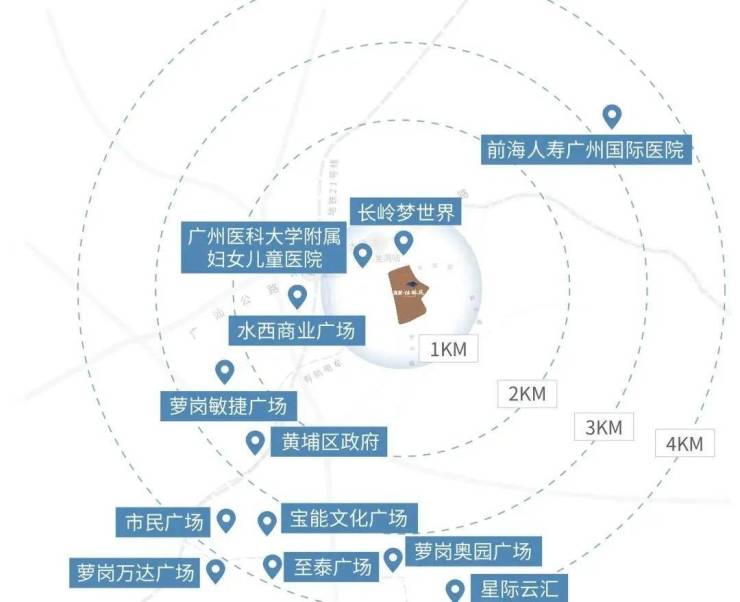 直线距离约800米地铁21号线长平站(走路大概1.1公里),1站黄埔区府(水西站),2站万达广场(苏元站),5站到天河(天河智慧城站);