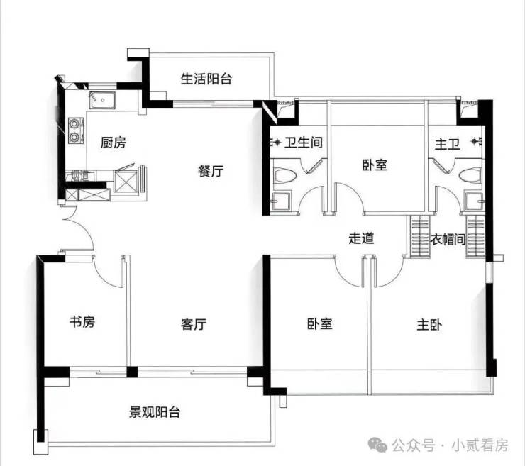 而约124㎡四房则是121㎡的PLUS版本,整体格局大差不大,不过就是在餐厅北侧多了一个生活阳台,而景观阳台也连接到了书房位置。