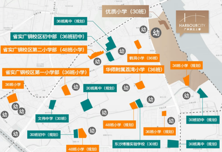 广州滨江上都自建一所12班幼儿园+一所30班小学,幼儿园是荔湾区青少年宫附属幼儿园(璇湾园),荔湾区青少年宫有“高素质人才的摇篮”的称号。小学是广东外语外贸大学附属小学(24年9月已开学),是广外教育集团落户荔湾区的第一所学校。