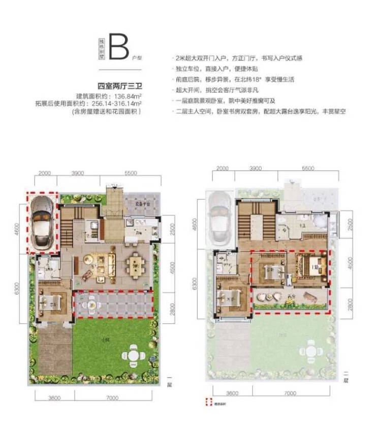 四室两厅三卫,建筑面积约136.84㎡,拓展后使用面积约271.14—331.14㎡(含房屋赠送和花园面积)