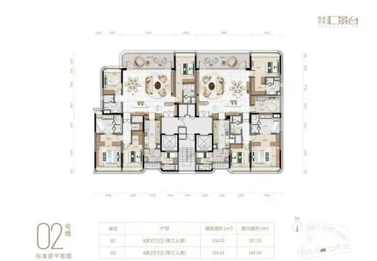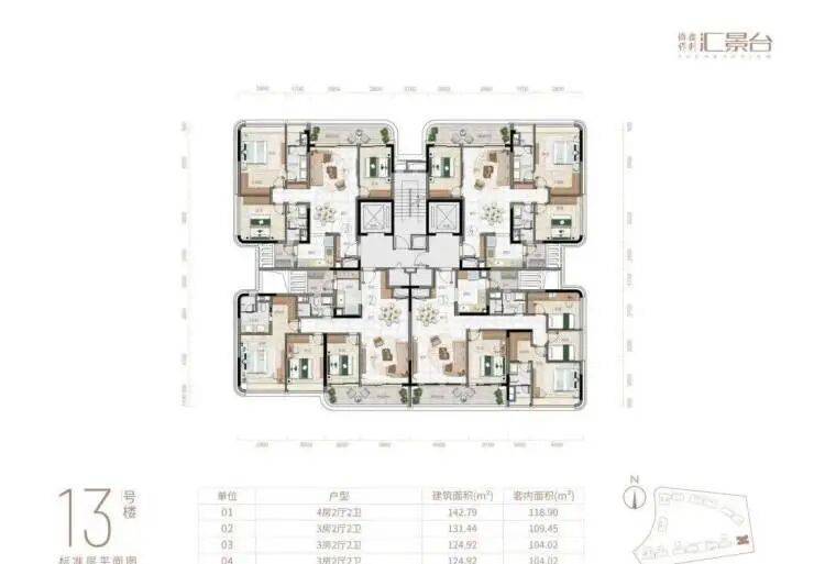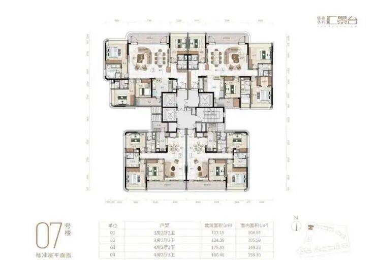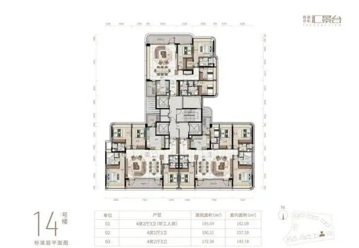 项目由14栋12层小高层组成,产品涵盖123-352㎡三至五房,共8类户型,户型实用率约82-84%