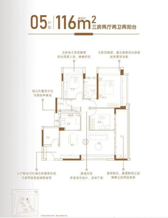 98㎡三房:主卧配备270°无柱飘窗,视野开阔无遮挡;次卧与阳台尺度升级,兼顾功能与舒适;