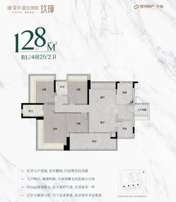 128㎡四+1房:独创独立入户花园,归家仪式感十足;厨房、客餐厅、主卧全面扩容,打造真正的改善级奢居体验。