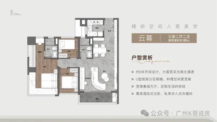 建面约88㎡三房两厅两卫;