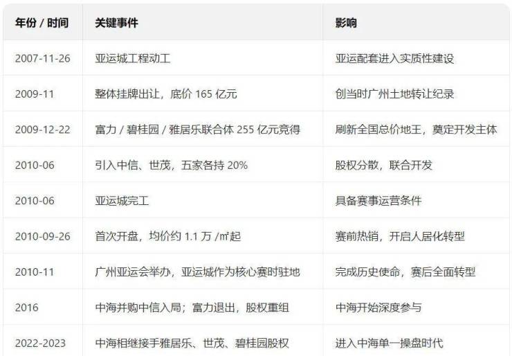 联合开发与人居化转型期(2010-2022)🏙️:赛后快速转为住宅社区,持续推售组团,教育、医疗、商业逐步落地(如广铁一中、广医二院番禺院区、亚运城广场);多次蝉联广州年度销冠,成为刚需与刚改的热门选择;股权历经多轮调整,中海通过并购逐步增持。