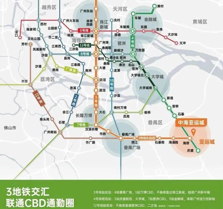 地铁交通:天际组团距离地铁 3 号线和 4 号线的海傍站 E 出口约 1.2 公里,步行需 19 分钟左右。从海傍站出发,乘坐 3 号线 4 个站到番禺广场,6 个站到长隆万博,13 个站到珠江新城;乘坐 4 号线 6 站可到琶洲,7 站到天河。此外,规划中的 8 号线东延段正在建设中,未来将进一步提升区域交通便利性。