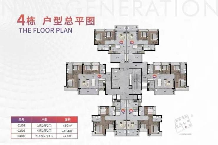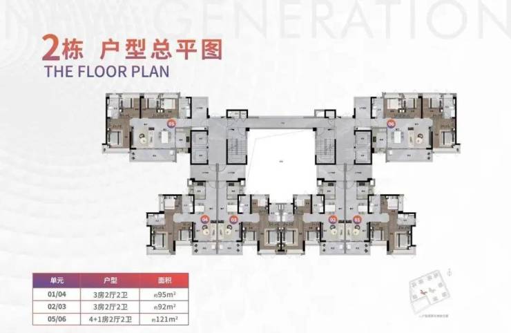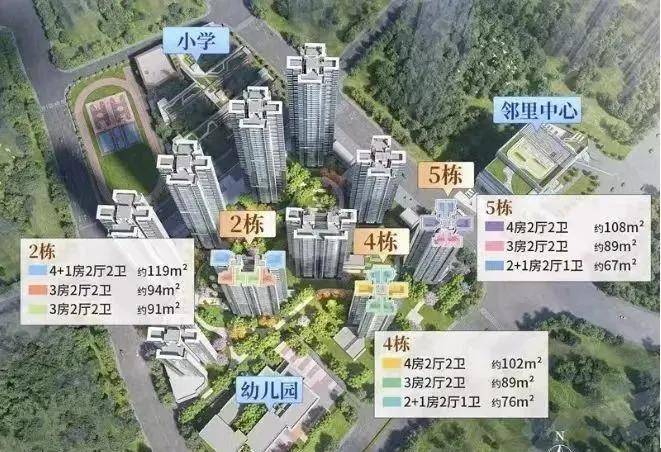 项目首推2、4、5栋,其中2栋是两梯三户,4和5栋是两梯六户,户型为建面约67-119平的二至四房。