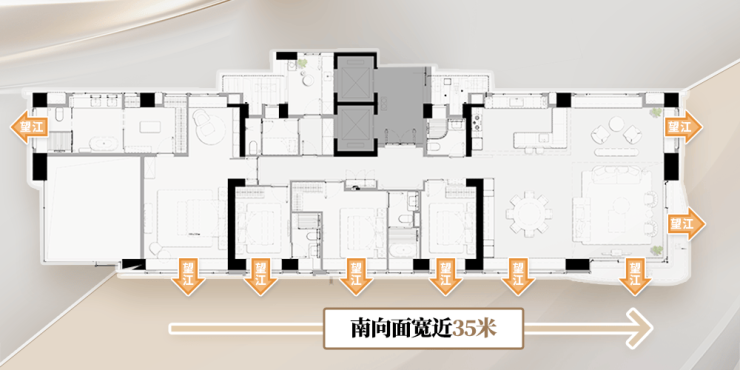 再看建面约275㎡户型,近10m转角连续屏江景,让约100㎡LDKB一体化大通厅,与整座城市繁华融为一体。