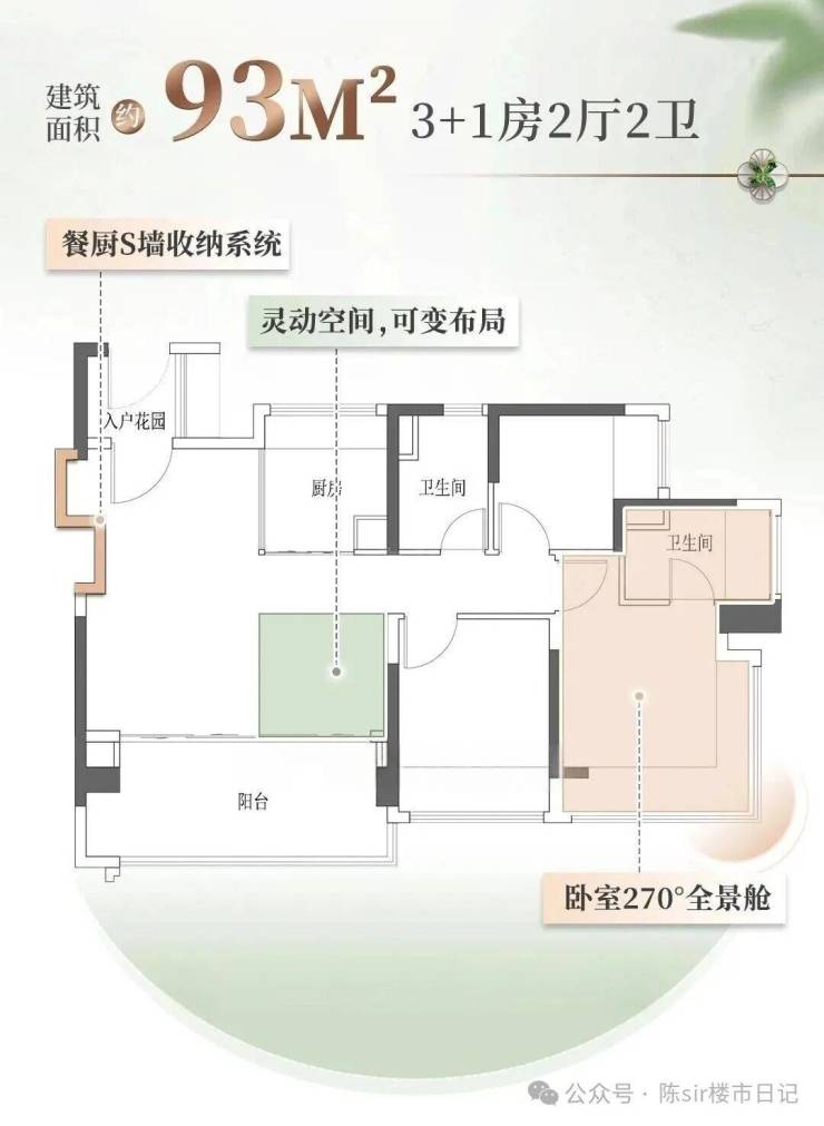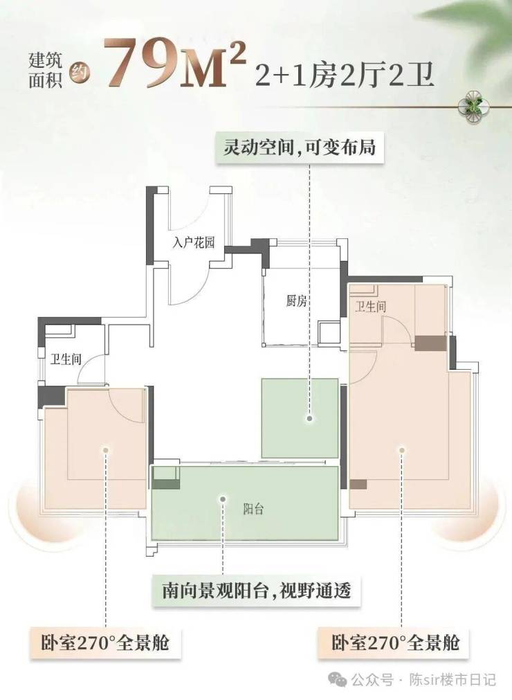 项目楼栋排布呈环抱式,彼此遮挡较少,而且全是南向的户型,整体视野不错,非常舒适。尤其是建面约79平的明星户型,几乎重新定义了科学城的小户型标准!