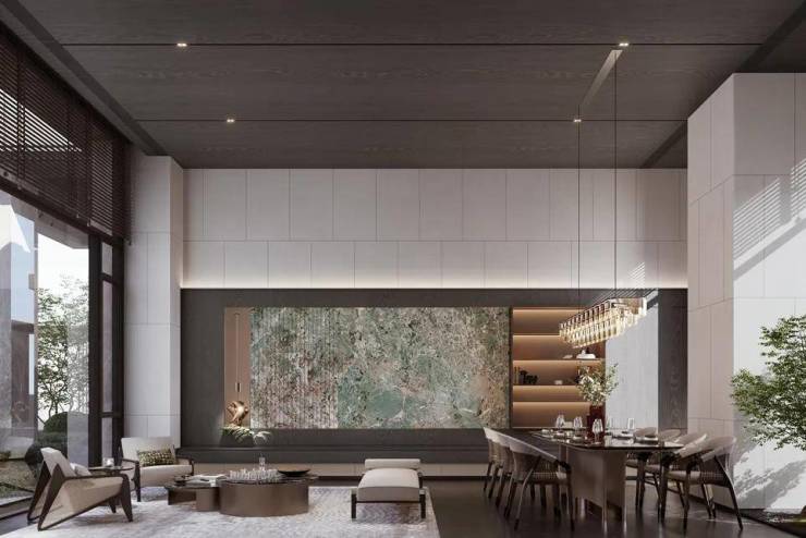 利用社区东大堂作为集中会所,植入接待区、咖啡吧、休闲书吧、共享办公等功能。根植岭南人文自然景观及名居特色,着力打造奢隐雅居。