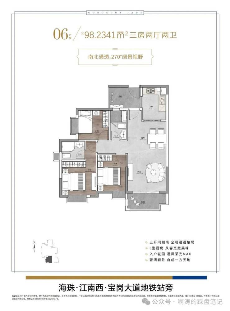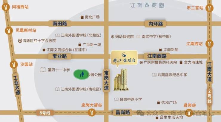 2/8号线双地铁上盖:约280米即达8号线宝岗大道站,20分钟直通达珠江新城;约800米2号线江南西地铁站,可通达广州南站等大型交通枢纽;
