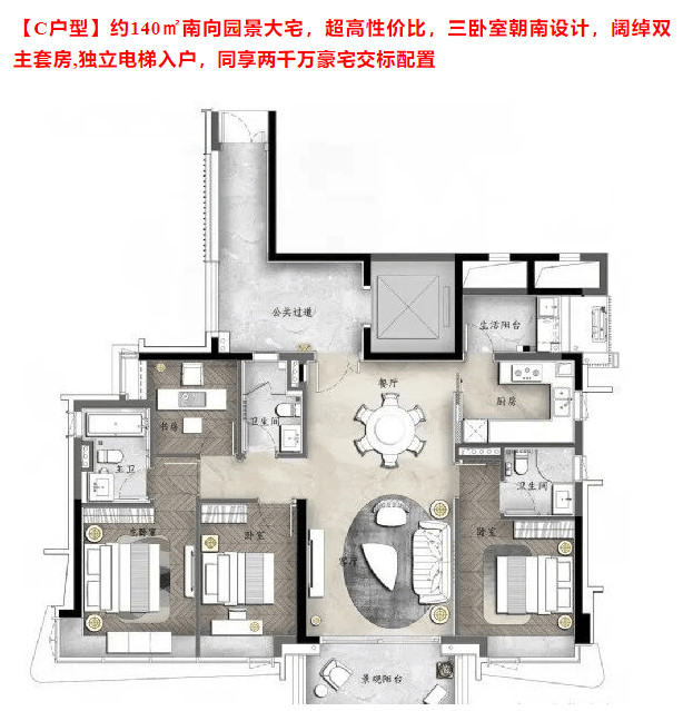 目前南天名苑在售产品包括高层江景洋房及全新推出的西区叠墅组团“珑岸”。洋房主力户型为140㎡至270㎡四房双主套,层高3.3米,4梯3户设计,配备独立电梯入户,部分户型拥有9米超大阳台及270°环幕江景视野。而“珑岸”叠墅则分为两叠与三叠两种形式,面积从279㎡至437㎡不等,使用率最高可达345%,每户均配私家电梯、私家花园及天台,部分下叠花园面积近800㎡,实现“有天有地”的别墅级体验。叠墅产品为简装交付,预计2025年11月交楼,首推仅29套,稀缺性极高。所有户型均采用多套房设计、6.8米挑高餐客厅、星级主卧套房等创新布局,兼顾三代同堂与私密社交需求。
