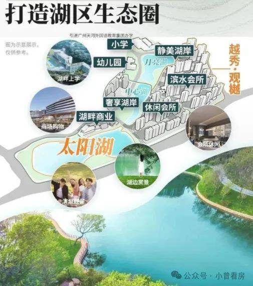 物业管理由越秀商管负责,物业费为 9.9 元 /㎡/ 月,提供 24 小时门岗值守、快递上门等日常服务。社区围绕 5.3 万方的日月双湖打造,湖岸线长达 1.9 公里,还规划了七大主题公园,目前湖水经过生态修复已达到地表二类饮用水标准,成为日常休闲的好去处。一期的 2000㎡会所已经投入使用,里面有恒温泳池、健身房、瑜伽室等设施,业主平时锻炼很方便。