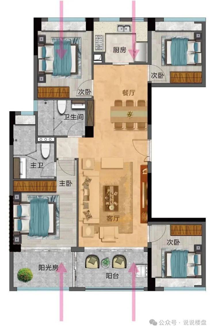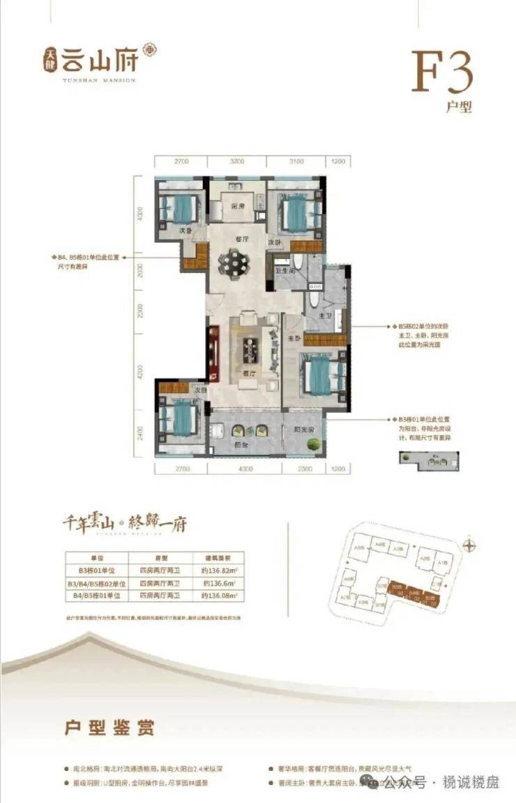 【F3户型-约136.5㎡】奢雅府境: 一梯两户,南北通透,全明空间更舒心。极致山景: 南向开阔观景阳台,直望一线云山盛景,豪阔厅堂:餐客厅分而不离,直连阳台,尽显大气,阔绰主套:配备独立阳台/卫浴,悦享奢华品质生活,人性设计:阳光房设计,充足储藏空间,完美收纳。