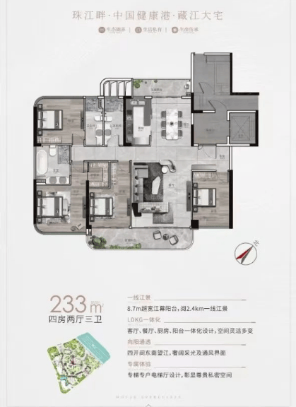 其中,1栋最靠近江边,户型涵盖233㎡/335㎡四房,为三梯两户设计。