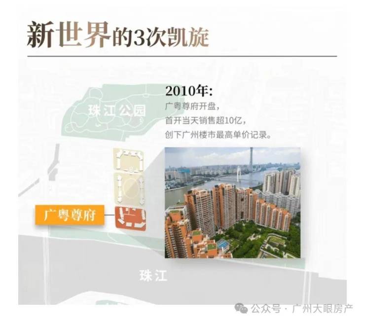 2010年,凯旋新世界广粤尊府首开,当天销售超10亿,一举创下广州楼市的最高单价记录。也正是这一年,广州楼价达到历史巅峰,涨幅为38%。