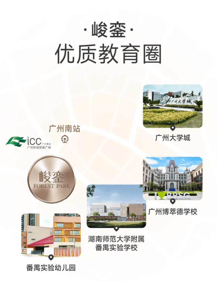 项目周边教育资源丰富且优质,为业主子女提供 15 年一站式教育服务。小区内配备 12 班公办番禺实验幼儿园,实现目送式教育,家长无需为孩子的接送问题而烦恼,让孩子在熟悉的环境中开启学习之旅。9 年制公办湖南师范大学附属番禺实验学校,作为全国百强高中榜第 11 名,拥有雄厚的师资力量和先进的教学理念,为孩子提供优质的基础教育。此外,还有广州博萃德学校,这是一所 15 年一贯制学校,与英国百年名校博耐顿联合办学,采用双语教学,核心课程包括国内课程与 IGCSE、A Level、Pre - AP 与 AP 国际课程体系,无缝衔接海外大学升学,为孩子搭建起与国际教育体系衔接的桥梁,助力孩子走向世界舞台。