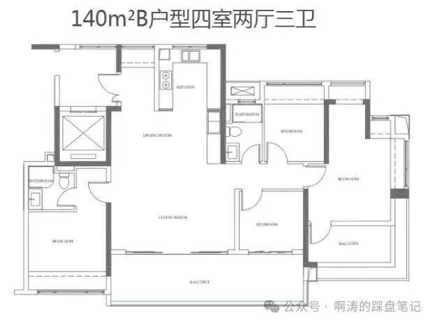 其三,270°飘窗+约8.4米南向巨幕阳台+双南向套房,户型很惊艳这个户型,四开间朝南,也是改善客户的首选。
