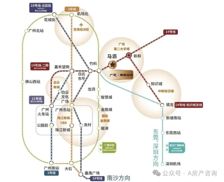 >>2站竹料站换乘双城轨,新白广城际(建设中,预计2023年开通)、广佛环线(建设中,东段预计2024年开通),速达天河智慧城、金融城、琶洲,通达湾区;
