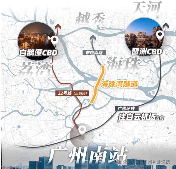 22号线(后通段)2025年开通,5站直达白鹅潭CBD。项目距离2号线,7号线地铁广州南站约1.5公里;6站到珠江新城,4站到海珠,4站到万博,小区有公交车和楼吧接驳地铁站。