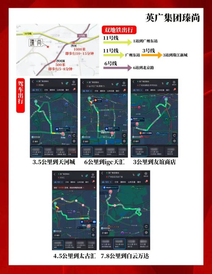 三地铁交织(5/6/11号线),距离6号线沙河顶站B出口约500米,1站至沙河站换乘广州大环线11号线,2站至区庄站换乘东西大动脉5号线。3站淘金,6站北京路、珠江新城,一线直达琶洲。