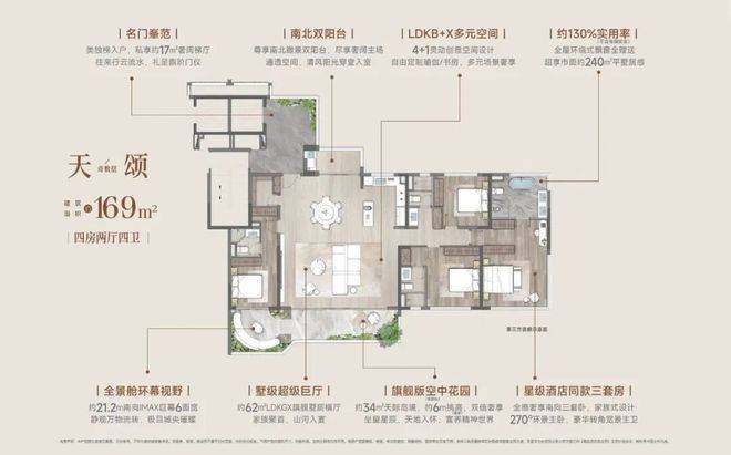至高约130%实用率(不含电梯厅),空间功能比肩约240㎡+产品空间。约21.2米南向IMAX巨幕6面宽+约62㎡LDKG-X旗舰墅质横厅+34㎡旗舰版空中岛院+全维奢享南向三套卧+270°环景主卧,犒赏层峯鼎豪享受。