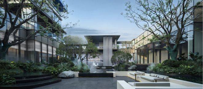 同时,下楼即拥揽浮岛会客厅的闲情雅致——晨曦初露时,潋滟水景倒映着天光云影;夜幕低垂时,叠韵流泉在月光下奏响自然的乐章,让安缦式东方园林的栖居诗意融入每一寸空间肌理,让业主都可以在自然与城市的双主场中自由切换。