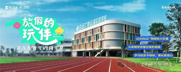 白云广附(广州市白云区白云广附云湖实验学校)就在小区里,白云湖第一所名校,有30班小学,18班初中,属于九年一贯制学校,2024年9月开到2年级,初二,逐年往上升。