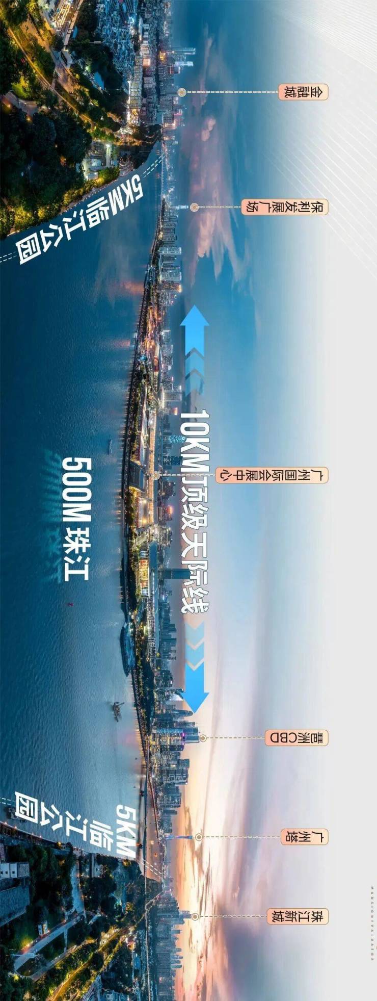 因为这个空中抬升,所有的住宅单位都拥有百米级别的珠江观景面宽。西至广州塔,东至保利发展广场,珠江新城和琶洲的世界级城市天际线,都在其视野范围之内。