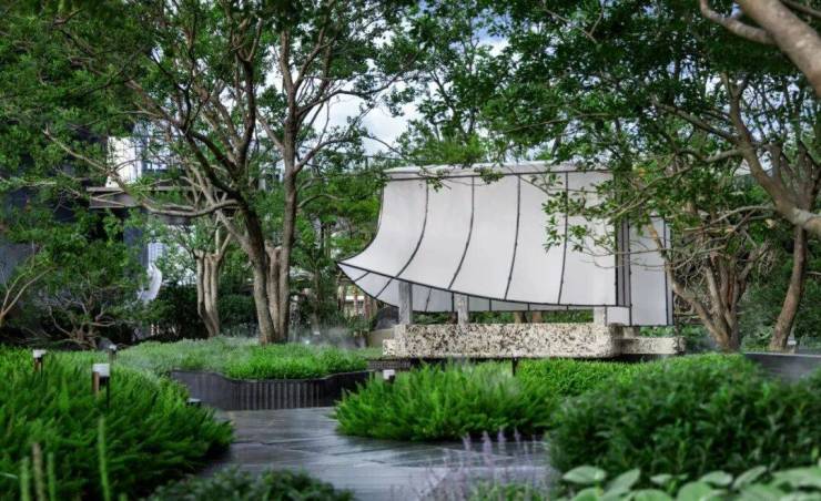 穿过滨江公园步入社区,安缦酒店同款度假风园林已局部呈现,没有效果图滤镜,全是真材实料堆出来的质感。