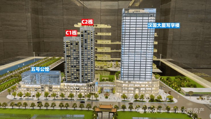1-4层为商业区并连通北侧的汉国大厦写字楼,5层架空,因此6层以上才是住宅楼,即C1栋住宅区高20层,2梯三户,C2栋住宅区高25层,2梯四户