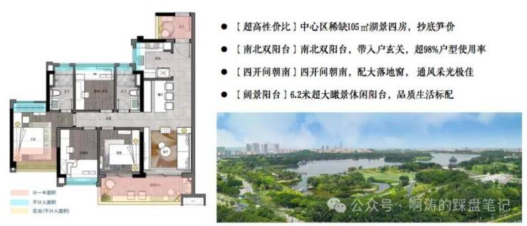 105㎡四房两卫:南向四开间瞰稀缺一线白云湖景,全市最笋湖景房价格
