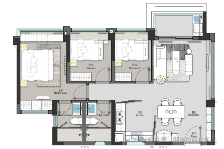 而雍云邸的做法,则是利用主卧的飘窗与飘窗实现对流,巧妙避开了卫生间,舒适性更强。