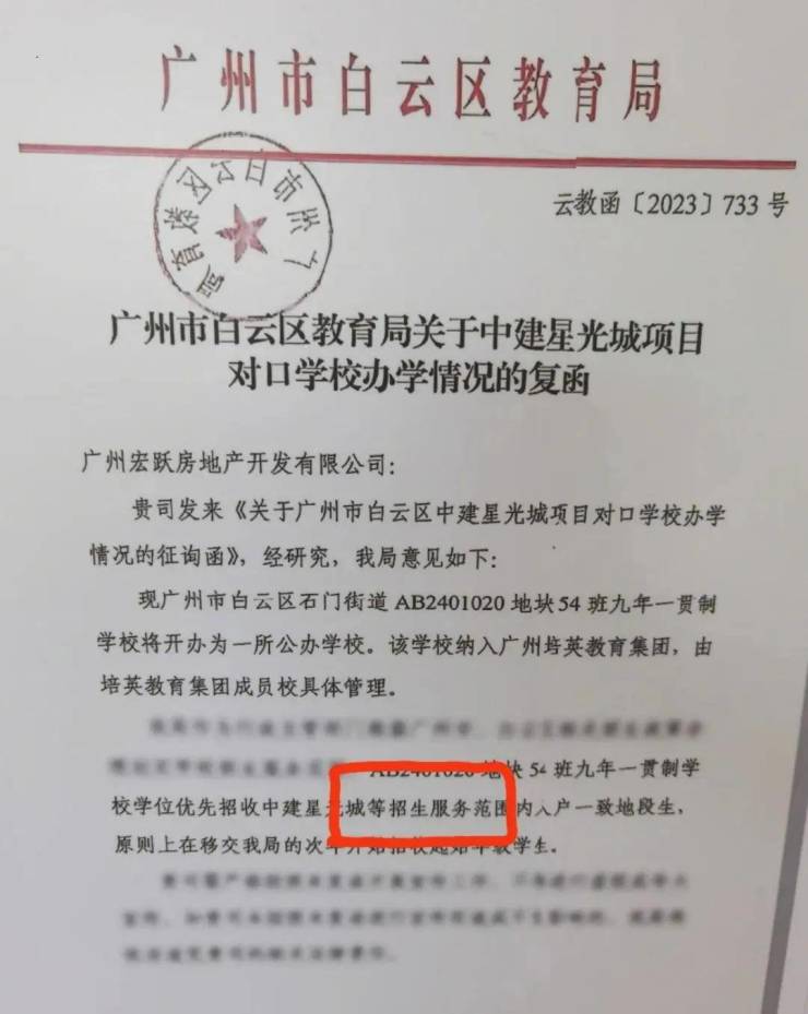 有些朋友可能会了解过这边,特别是了解过中建星光城的朋友,那边的销售会说学校优先他们的业主入读,还会给你看以下的文件,但其实不是的,他们跟你玩起了文字游戏,大家重点看圈起的文字:等招生服务范围,还是人户一致优先为主