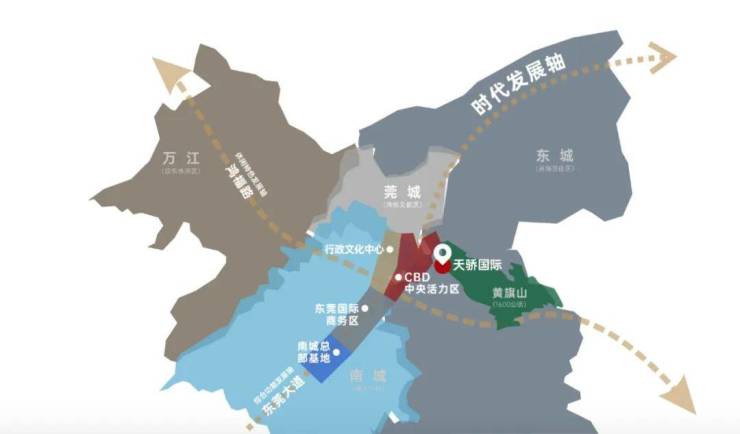 俯瞰脚下土地,这座城市的“时代发展轴”与“山水文化轴”在此交汇,也称之为“黄金十字轴”。在这片臻稀之地,集聚了政治、经济、文化、生态等城市功能,是自然优势突出、市级设施集中、发展阶段成熟的东莞门户。
