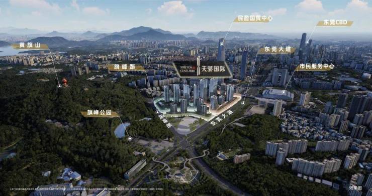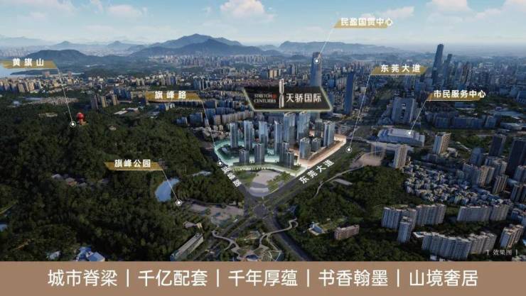 从天骄国际向远处眺望,约243公顷黄旗龙脉绿意绵延,山色秀丽。黄旗山的灯笼,映照在天骄国际的玻璃幕墙上,一笔一画绘就项目的顶豪底色。这里,不仅是东莞的城市名片,更是东莞人的精神信仰。